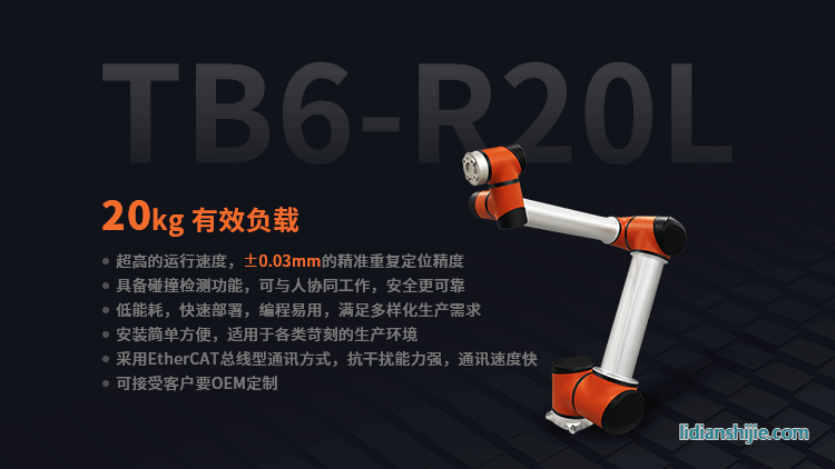 以往,協作機器人因其靈活輕量的特征,主要被客戶用來處理對負載要求不高的任務。但近年來越來越多的企業希望在更高負載的領域也使用協作機器人來替代過往由傳統工業機器人操作的任務。在市場對大負載機器人有著急切的需求時,深圳泰科智能機器人TB6-R20L協作機器人在負載能力、作業范圍等多方面實現了全面突破,在實現20KG大負載和1500mm工作半徑的同時,重復定位精度高達±0.03mm,重新定義了協作機器人,并已經成功為客戶定制30KG大負載的協作機器人。