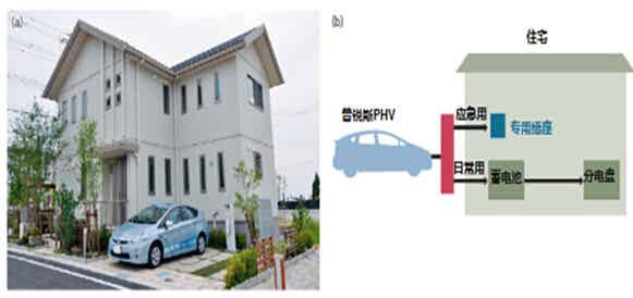(a)從普銳斯PHV的普通充電接口將電力輸送給室內的蓄電池儲存。(b)日常使用時將汽車輸出的電力儲存于蓄電池內使用。
