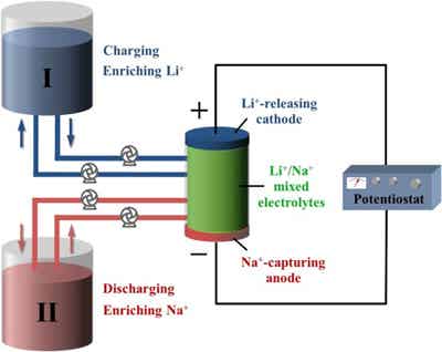 此外,該新型電池獨(dú)特的工作方式還使其具有Li+/Na+分離的功能。通過構(gòu)建如圖2所示的簡單反應(yīng)體系,通過反復(fù)的充放電過程即可分別實(shí)現(xiàn)對(duì)Li+和Na+的富集,與現(xiàn)有的化學(xué)分離技術(shù)相比操作更為簡便且更加綠色環(huán)保,因此該技術(shù)在海(或鹵)水中Li+和Na+的大規(guī)模分離方面具有重要的應(yīng)用前景。
