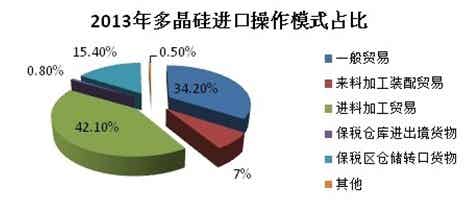 業(yè)內(nèi)人士稱,因?qū)n國(guó)最大的多晶硅企業(yè)OCI僅征稅2.4%,可以說(shuō)多晶硅“雙反”主要針對(duì)美國(guó)。但美國(guó)通過(guò)加工貿(mào)易的方式有效規(guī)避征稅,2013年通過(guò)進(jìn)料加工貿(mào)易的方式進(jìn)口多晶硅的比例增加至42.1%,一般貿(mào)易方式占比從2012年的50%左右減少至2013年的34.2%(如下圖)。
