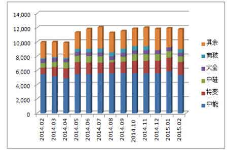 硅業分會統計,2015年1-2月份國內多晶硅產量為2.37萬噸,1月份產量為1.19萬噸,2月份產量為1.18萬噸,其中江蘇中能的產量占國內1-2月份總產量的48%,依舊位居國內產量第一位,特變電工和洛陽中硅分別居第二、三位,1-2月份前三大企業產量占總產量的70.4%。1月份國內有3家企業停產檢修,2月份全部恢復生產,目前17家在產企業中,開工率達到100%的企業有7家,其余企業也生產穩定,江蘇中能和特變電工均為超負荷運行,進一步降低了成本,提高了效益。