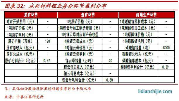 碳酸鋰業(yè)績(jī)測(cè)算:對(duì)于公司碳酸鋰業(yè)務(wù)的測(cè)算,由于公司已經(jīng)實(shí)現(xiàn)全產(chǎn)業(yè)鏈布局,采礦-選礦-終端產(chǎn)品三個(gè)環(huán)節(jié)都會(huì)產(chǎn)生相應(yīng)利潤(rùn),目前而言,伴隨著碳酸鋰價(jià)格快速下跌,越靠近終端其盈利壓力越大,反而是上游的礦石采掘和篩選環(huán)節(jié)利潤(rùn)更為豐厚,因此為了詳細(xì)拆分公司鋰產(chǎn)品盈利分布,我們將各環(huán)節(jié)分開(kāi)測(cè)算。1)采礦:公司目前擁有花橋、花鋰礦業(yè)兩大礦業(yè)公司,按照原礦年產(chǎn)量120萬(wàn)噸測(cè)算,貢獻(xiàn)毛利0.37億元,值得注意的公司分別持有花橋、花鋰公司70%、45.85%股權(quán),對(duì)應(yīng)上市公司業(yè)績(jī)應(yīng)當(dāng)乘以相應(yīng)比例;2)選礦:永興新能源與永誠(chéng)鋰業(yè)分別擁有120萬(wàn)噸及50萬(wàn)噸選礦能力,以6:1的選礦能力采選出精礦(鋰云母),按照20萬(wàn)噸鋰云母產(chǎn)量測(cè)算,其貢獻(xiàn)毛利0.6億元;3)碳酸鋰:按照碳酸鋰價(jià)格54000元,全年銷量8000噸測(cè)算,貢獻(xiàn)毛利0.39億元,綜上統(tǒng)計(jì),公司鋰產(chǎn)品有望貢獻(xiàn)毛利1.25億元;