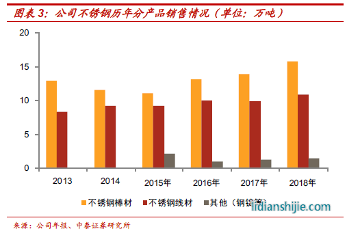 產(chǎn)能與產(chǎn)品結(jié)構(gòu):公司目前具有35萬(wàn)噸不銹鋼和鎳基合金煉鋼產(chǎn)能,其中煉鋼一廠電爐30t年產(chǎn)能10萬(wàn)噸(之前受到生產(chǎn)工藝限制,實(shí)際產(chǎn)量只有6-7萬(wàn)噸,經(jīng)過(guò)2019年的技改之后,未來(lái)公司實(shí)際產(chǎn)量將接近滿產(chǎn)狀態(tài)),煉鋼二廠電爐50t年產(chǎn)能25萬(wàn)噸。從軋材環(huán)節(jié)而言,公司線材、大盤(pán)卷以及棒材產(chǎn)能共計(jì)25萬(wàn)噸,剩余5萬(wàn)噸鍛打產(chǎn)線、鋼錠銷售2萬(wàn)噸、委外鍛打2萬(wàn)噸。通過(guò)近幾年產(chǎn)線的不斷調(diào)整和升級(jí),公司目前煉鋼與軋材環(huán)節(jié)實(shí)現(xiàn)基本匹配,隨著煉鋼一廠實(shí)現(xiàn)完全達(dá)產(chǎn),后期產(chǎn)銷量仍有提升空間;