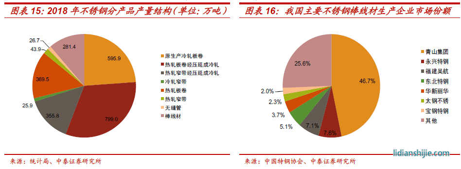 供給向棒線材龍頭企業(yè)高度集中:2018年我國(guó)不銹鋼產(chǎn)量2498萬(wàn)噸,其中卷板2190萬(wàn)噸,而不銹鋼棒線材產(chǎn)量?jī)H有281.4萬(wàn)噸(表內(nèi)口徑,包括表外總產(chǎn)量約370萬(wàn)噸),占比僅有11.3%。在這相對(duì)小眾的領(lǐng)域,棒線材的供給格局仍然呈現(xiàn)典型的頭部聚集特征,前五大生產(chǎn)企業(yè)便占據(jù)了70.1%的市場(chǎng)份額,其中青山集團(tuán)作為最大的不銹鋼棒線材生產(chǎn)公司,2018年總產(chǎn)量達(dá)到173萬(wàn)噸,接近一半,而永興材料則以28萬(wàn)噸屈居第二。和普碳鋼相比,不銹鋼前五大企業(yè)市占率明顯偏高(2018年前五大鋼企粗鋼市占率僅有23.5%),這主要是由于不銹鋼中高端市場(chǎng)具有相對(duì)嚴(yán)苛的技術(shù)與認(rèn)證門檻,新進(jìn)入者較少,并且多集中在制造業(yè)等零散的低端市場(chǎng);