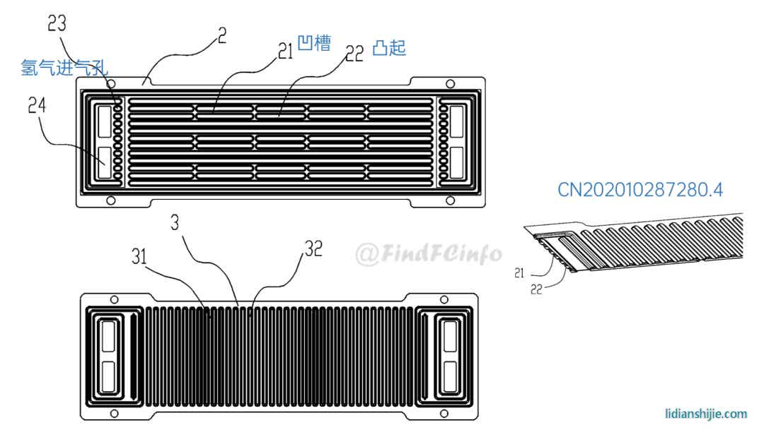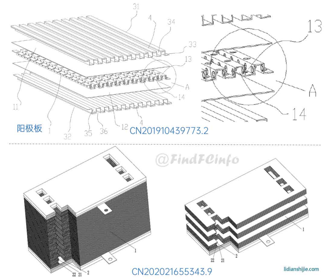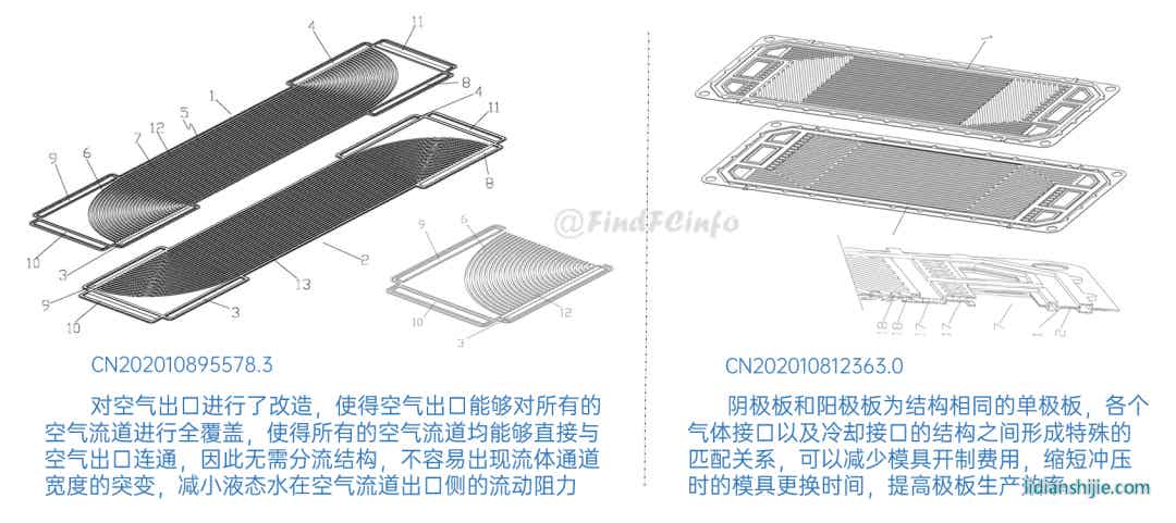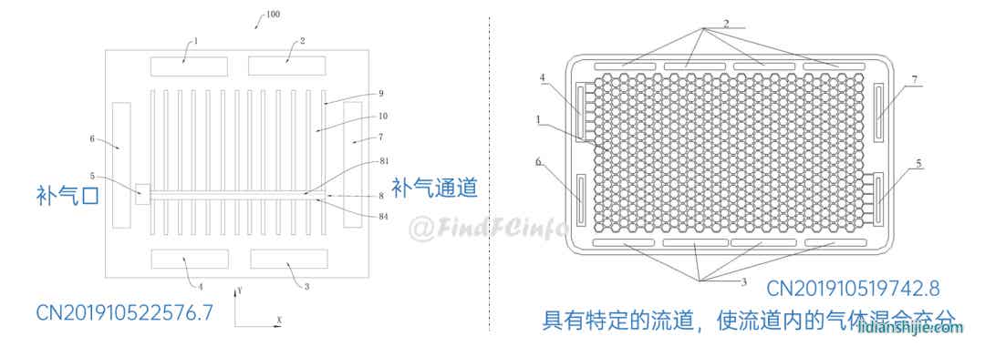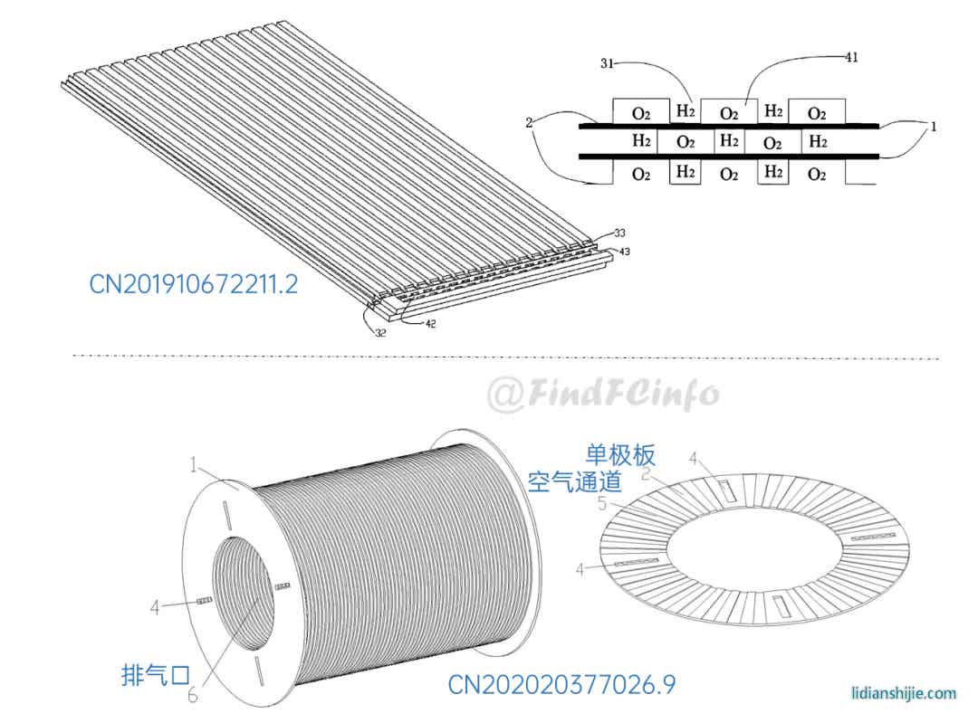 另外,格力還公開了兩種風冷型電堆,如專利CN201910672211.2公開的電堆中,膜電極和單極板在電池單元疊置方向間隔交錯設置,每一單極板的兩側(cè)分別形成陽極氣體槽道和陰極氣體槽道,相比于現(xiàn)有常規(guī)金屬雙極板燃料電池結(jié)構(gòu),該電堆厚度能大約降低一半,極板兩側(cè)分別為陽極氣體和陰極氣氣體的流動空間。專利CN202020377026.9中電堆增加了進風區(qū)域面積,形成了更加均勻的進風結(jié)構(gòu),有利于提高陰極反應氣體傳質(zhì)、提高陰極反應氣體流量、降低其流動阻力等。