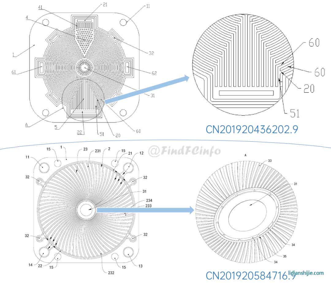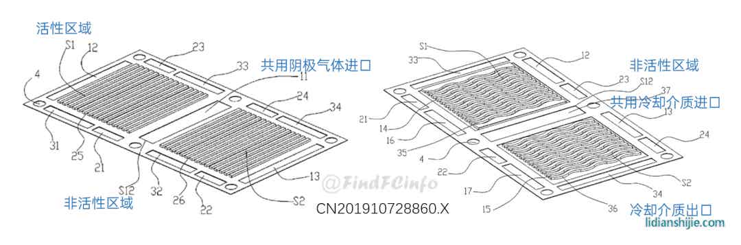 格力雙極板的主要類型為金屬雙極板,大部分雙極板用于水冷型電堆,少數(shù)雙極板用于風冷型電堆。在格力早期申請的雙極板專利中,有采用將冷卻水入口設置在極板中心位置處的設計,以更好地對極板中央反應區(qū)域進行冷卻,具體極板結(jié)構(gòu)可參見下圖。