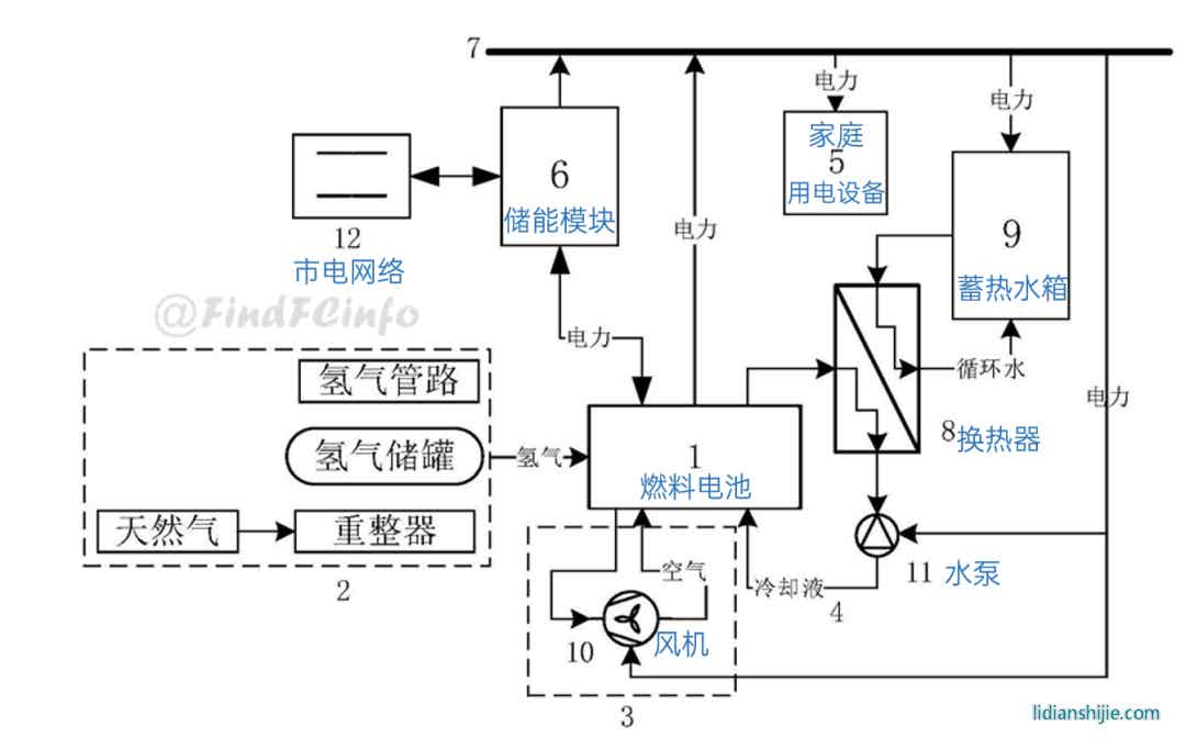 專利CN202020515628.6公開了一種家用熱電聯(lián)供系統(tǒng),其中蓄熱模塊能夠回收燃料電池的廢熱,并將熱能提供給家庭使用;儲能模塊能夠接收并存儲燃料電池的電能;直流供電模塊能夠?qū)⑷剂想姵睾蛢δ苣K提供的電能輸送給家庭用電設備。