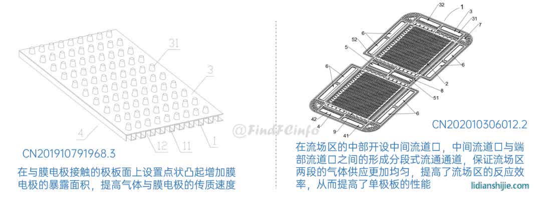 在通過雙極板結(jié)構(gòu)優(yōu)化改善冷卻液流動以及促進排水方面,專利CN201911093404.9通過使相連接的極板的冷卻流道沿冷卻液流動方向?qū)ΨQ設置,且其交疊區(qū)域重合,同時優(yōu)化氣體流道與冷卻液流道的寬度比,來降低冷卻液流動時的流阻,降低燃料電池的寄生功率;專利CN202010238488.7通過一面設置蛇形氣體流道,一面設置直線型、弧形或折線形的冷卻流道,來改善排水性能和降低冷卻液的流動阻力。