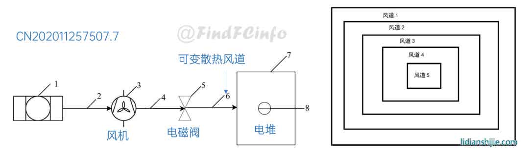 在燃料電池熱管理方面,格力公開的專利既涉及風冷型電堆,也涉及到水冷型電堆。在風冷型電堆熱管理上,專利CN202011257507.7通過在電堆和風機之間設置可變散熱風道,利用控制器調(diào)整可變散熱風道上多個散熱子風道的開啟數(shù)量或關閉數(shù)量,來實現(xiàn)對電堆的精準控溫。