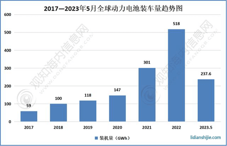 據觀知海內信息網統計數據顯示,2022年全球動力電池裝車量達518GWh。2023年1月到5月,全球動力電池裝車量237.6GWh ,同比增長52.3%。預計2023年全球動力電池裝車量將突破700GWh。