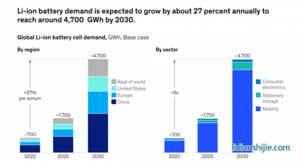 報告顯示,全球對鋰離子電池的需求預計將在未來十年飆升,從2022年的約700GWh增加到2030年的約4.7TWh。此外,用于電動汽車等移動應用的電池將在2030年占大部分需求-約4300GWh。