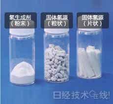 這種電池的燃料其實是“氫化鈣”。因遇水后會產生氫,因此命名為“固體氫源”。制成薄板型時,重量約為5g。滴下5~6cc的水會產生4.5~5L的氫。