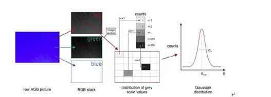 原始的RGB圖像分割成紅(red)、綠(grenn)、藍(blue)三原色,將圖像劃分為10x10個部分,計算分析每個部分細節(jié)。對像素點三原色分量灰度值進行計數(shù),然后做成高斯分布圖,標準偏差σ和平均灰度值nmax作為圖像處理的特征量。