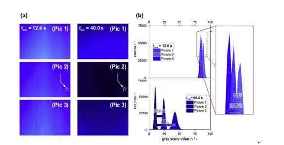 圖5 (a)在兩個干燥時刻,各自連續(xù)拍攝的三張照片的比較。捕捉第二張照片時,用加壓空氣噴嘴向照相區(qū)域涂層上直接噴射空氣氣流。(b)在較短干燥時間(texit=12.4s)時,三張照片中獲得的nmax都很大,差值Δn12和Δn23小并且都落在試驗值偏差范圍內(nèi)。而texit=40.0s時,三個nmax都很小,噴嘴作用導(dǎo)致的差值Δn12和Δn23很大。