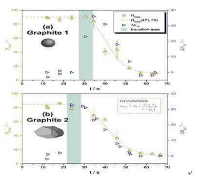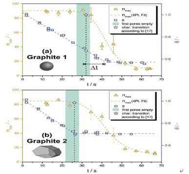 (a)Graphite1(球形,d50=8.9μm),(b)Graphite2(多面體,d50=20.4μm)。從nmax開始減少到平臺結(jié)束的時間間隔以以綠色突出顯示,這表明第一個孔洞形成時刻。五角星標記是文獻的轉(zhuǎn)換時間。