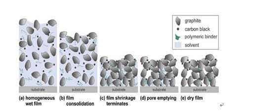 (a)溶劑蒸發(fā)引起初始均勻濕涂層收縮;(b)溶劑蒸發(fā),石墨顆粒彼此接近;(c)當石墨顆粒獲得最密集的組態(tài)時,涂層收縮終止;(d)孔隙消失,溶劑進一步的蒸發(fā)導(dǎo)致液相散出多孔電極結(jié)構(gòu);(e)干燥的電極。