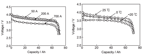 評價LVP65電池的放電性能,在25℃的環境溫度中以70A的恒電流充電至電壓4.025V,接著繼續以相同的恒電壓充電3小時后,再以50、200及700A的電流值放電至2.75V,其放電特性示于圖5。并可確認電流值大極化也增大,隨之而來的是電池電壓下降。既便是在700A(約10ItA)以50A放電時最高可獲得97%的容量。接著因環境溫度的影響。在相同的條件下充電,環境溫度從-20、0及25℃之后,電池溫度達到與環境溫度相同經過充分的時間放置后,以70A電流放電至2.75V,此時的特性示于圖6。環境溫度越低,電池電壓越低,在-20℃的低溫條件下最高可獲得25℃時放電容量的98%。也就是說,LVP65電池可用作寬溫范圍的飛機用途,并可維持優良的放電性能。