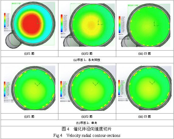 圖3是兩個項目催化體軸截面速度場帶矢量的云圖,圖4是對兩個項目制作多個徑向截面速度切片,所取切片位置示于圖3(a)中,與S0分別相距10mm(S1)、20mm(S2)、30mm(S3),以便觀察氣體在催化體內部的流動特性。