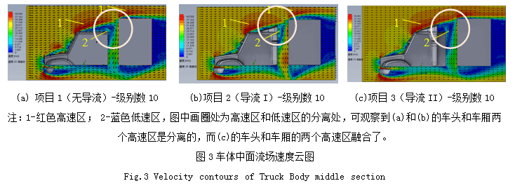圖3是車體在流場中的速度分布云圖(取中面),對比三個項目,可清晰觀察到:項目1和項目2在車頭與車廂之間形成的兩個高速區(qū)組成的流線區(qū)是分離的,而項目3的兩個高速區(qū)組成的流線區(qū)幾乎是融合的。另外,云圖的顏色從藍至紅,表示空氣流速不斷增高,因此紅色區(qū)為高速區(qū),而藍色區(qū)為低速區(qū),速度發(fā)生驟變的區(qū)域稱為分離區(qū)。從圖可看到,車頭上方形成的氣流高低速分離區(qū)的形狀,無導(dǎo)流罩時,駕駛室上方的流體流線軌跡形成明顯的高速與低速的分離帶,項目2導(dǎo)流罩由于沒有完全占據(jù)高速與低速的分離帶,仍不符合流線軌跡,因此項目2的兩個高速區(qū)仍是分離狀態(tài),項目3導(dǎo)流罩幾乎完全占據(jù)了高速與低速的分離帶,外形從設(shè)計上也幾乎符合了流線軌跡,因此,項目3的兩個高速區(qū)幾乎融合在一起。