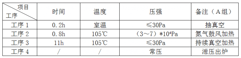 選用本公司生產的磷酸鐵鋰A 型電池進行干燥實驗,使用真空非接觸式干燥爐,對電池采用真空熱輻射干燥。干燥溫度為105±5℃,時間為5~12h,取磷酸鐵鋰A 型電池30 支電池,放入真空接觸式干燥爐中,干燥工藝流程如表1-3: