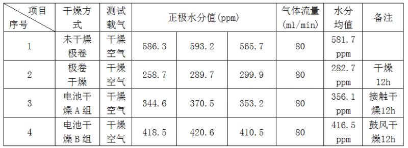 對電芯的干燥采用接觸式和非接觸干燥方式(即真空熱傳導和真空熱輻射的方式),通過卡爾費休-庫倫水分測試檢測結果如下: