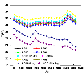 其中,熱成像結果顯示的顏色不同顯示溫度的變化情況。對試驗過程中電池的表面溫度取圖中所示的10個區域,分別用AR1、AR2、AR3、AR4、AR5、AR6、AR7、AR8、AR9、AR10標記。