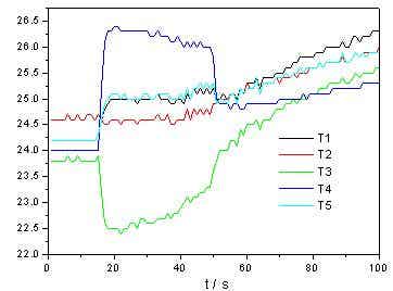 整個過程中,溫度點1~5的變化如圖10所示,從圖中可以看出,在短路時間(有電流存在),采集點3、4呈現不同的溫度變化趨勢,而1、2、5采集點的溫度變化趨勢基本一致。引起這種變化的主要原因是MGL在電池設計方面上進行了改進,有效的防止了高電流通過時引起的熱失效現象。整個短路過程中,電池在外觀上無任何變化,電池沒有燃燒、沒爆炸,符合安全標準。